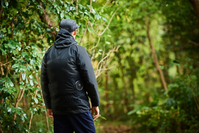 ファンが回る事で膨張するシルエットをスタイリッシュに見せるため、袖口にはベルクロでの絞りをつけて、中はウエストベルトで調整するなどフォルムとデザイン性を重視しました。生地には耐水20,000mmレベルの防水性と8,000g/m2/24hrの透水性のものをさらに動きやすさと着心地も意識し高品質な3層のものを選びマウンテンパーカーとベストを株式会社ビッグウイングと共同開発致しました。