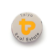 福岡市は九州大学箱崎キャンパス近くで、不動産業を経営される有限会社大洋不動産様の社章にも、黄色のロゴマークが銀色のベースに配置されています。今まで社章はありませんでしたが、社員の方が増えたのを機に、会社に対する自覚や仕事へのモチベーションアップの目的で製作されました。大洋の「t」とハート形で構成されたデザインはプロの方に依頼されたそうで、名刺や封筒など様々な場所で使われています。作品にはそれを取り囲むように「Taiyo」と「Real Estate」の英文字が入り、高品質で目にとまりやすい仕上げとなりました。