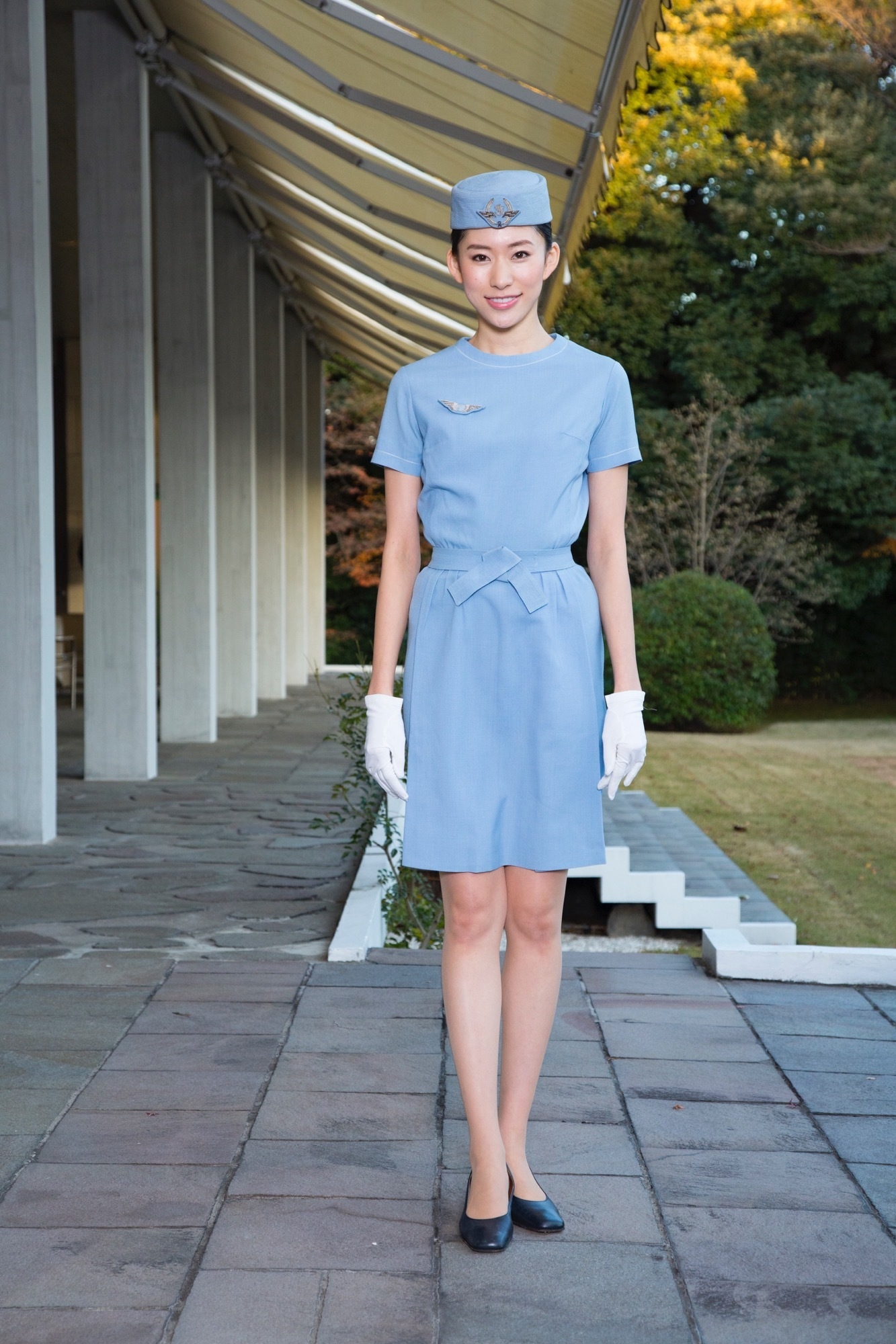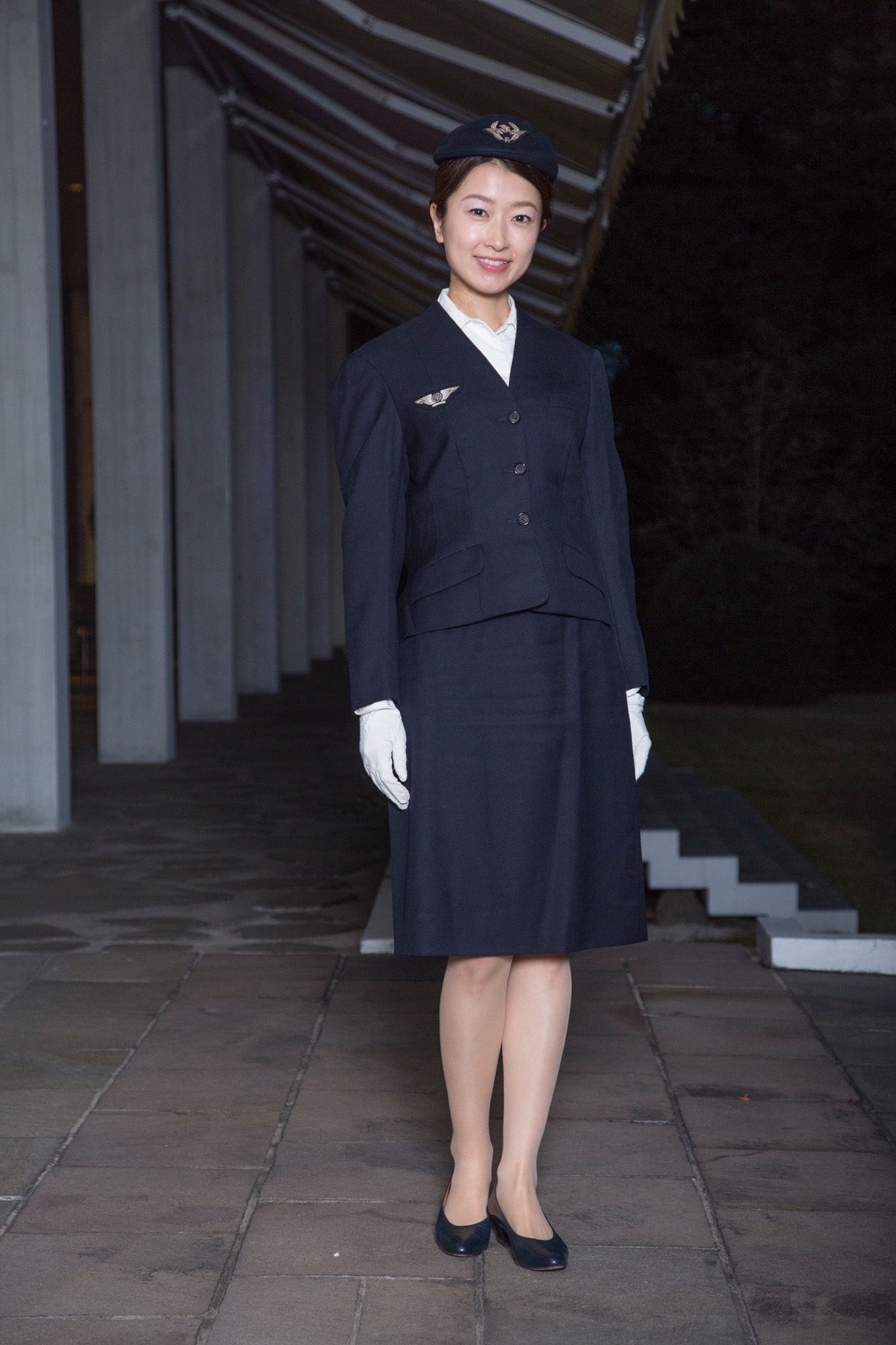-カルヴァンのワンピース。濃紺地に白い襟、白いカフス、ストライプのボウタイ。乗務員から圧倒的な人気を博した紺色のワンピースは18年に渡って愛用された。