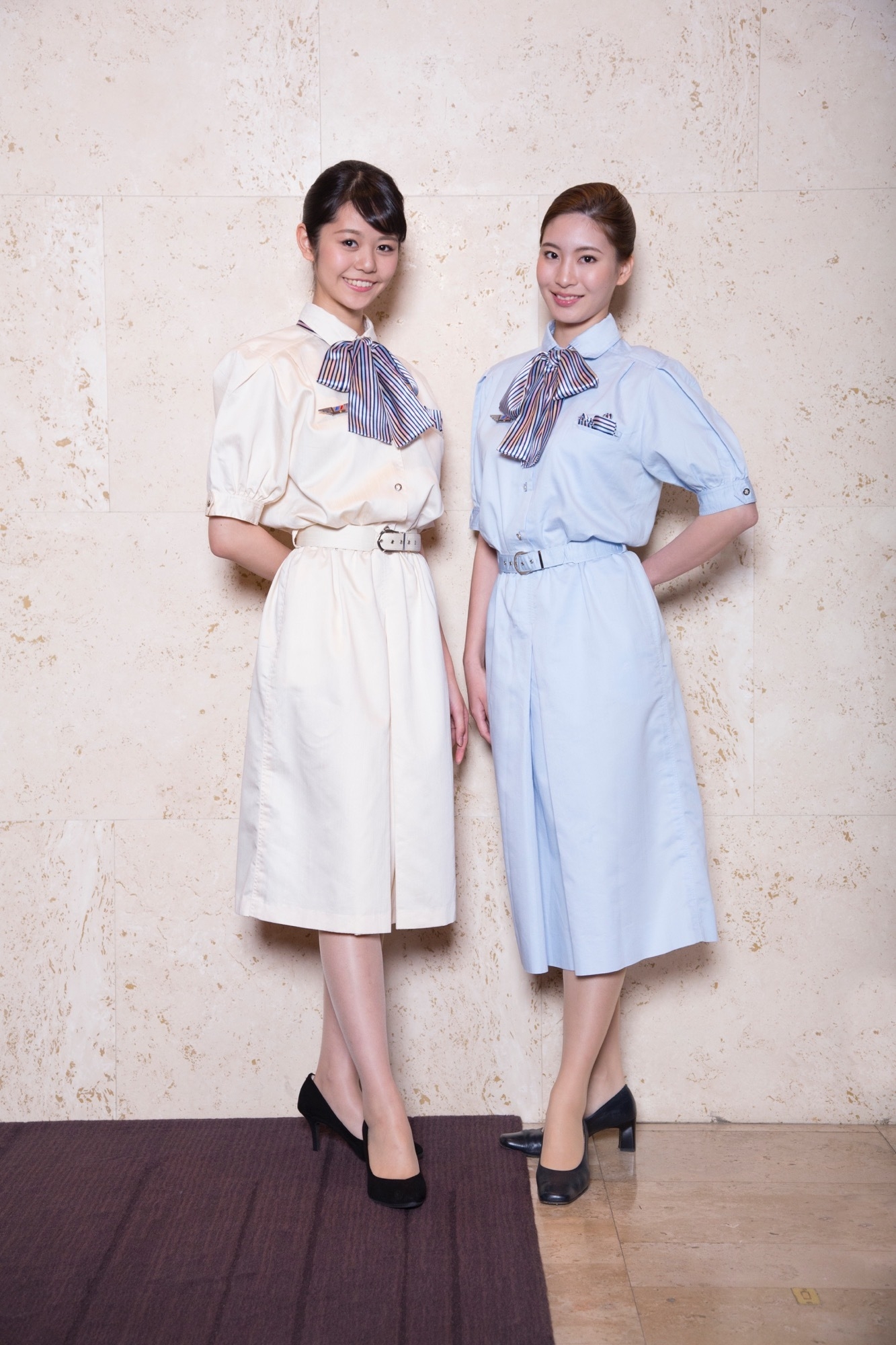 世界的なオートクチュールメゾンに依頼した最初の制服。夏の水色のワンピース、紺色の冬のスーツ、共にステッチ使い、ベルトやブラウスの胸元のリボン飾りに日本の帯をイメージした当時のモチーフが使われている。複雑な型紙で、外から見えない隠しポケット、一見ツーピースに見えるウエストラインの切り替えやほっそりしたラインを作る微妙なダーツなどにクチュールメゾンのテクニックが駆使されている。