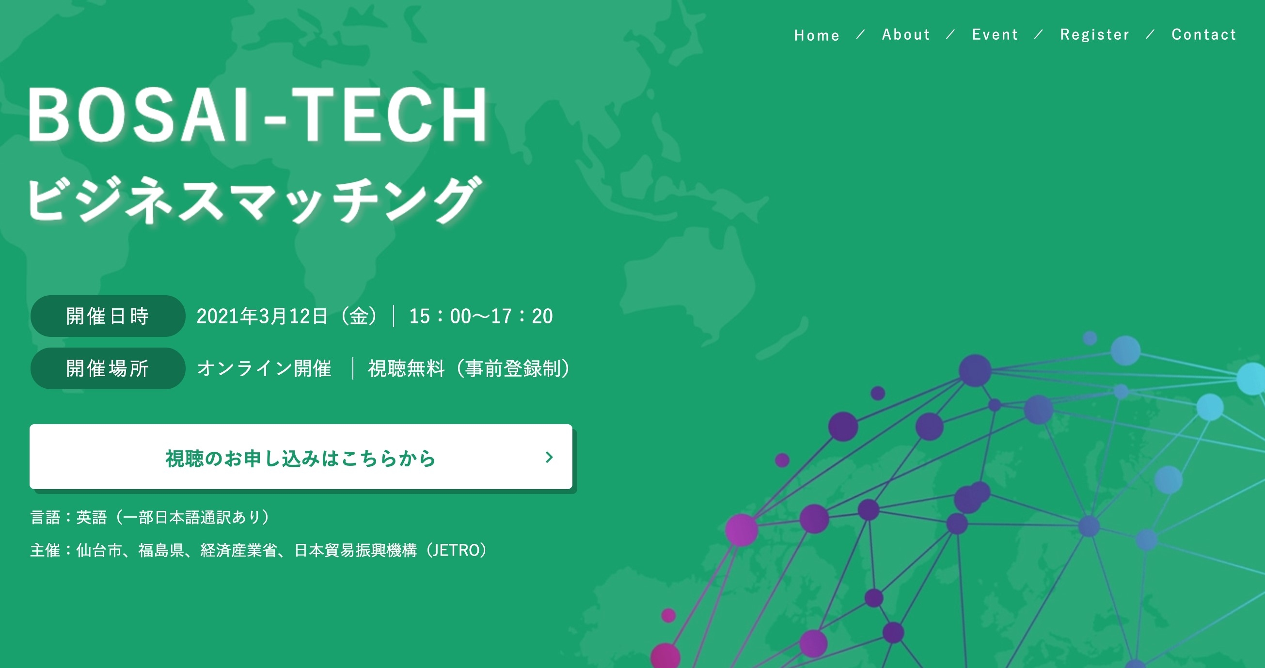 【仙台市】★視聴者募集中★「BOSAI-TECHビジネスマッチング」 防災をテーマにしたグローバルイベントを開催!(3月12日)