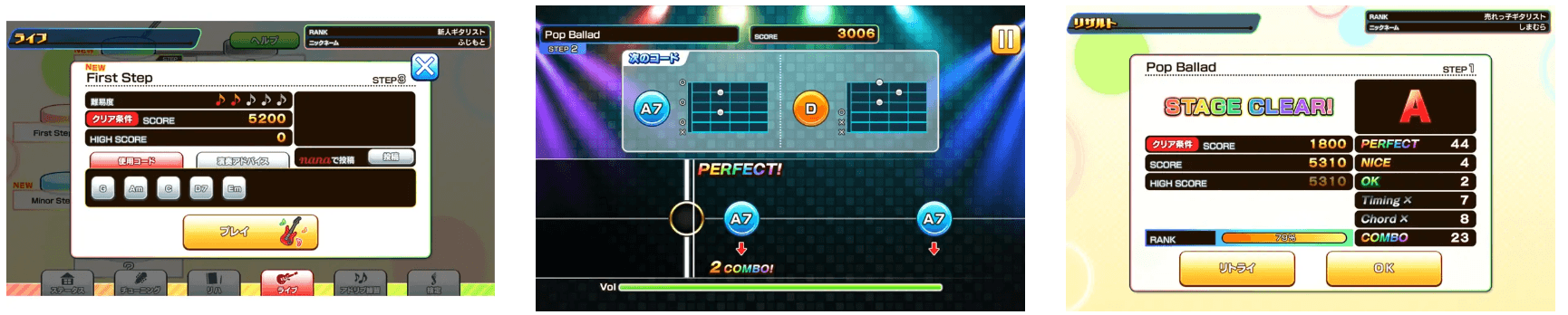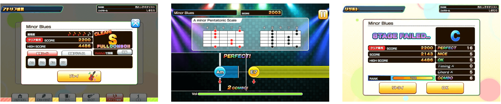 ポップ、ロック系を中心とした課題曲でパワーコードやストローク奏法を実践的にトレーニングすることができます。演奏後に表示されるスコアにより上達度合いがわかります。また各曲のゲーム画面では、使用コードと演奏アドバイスを確認することができます。