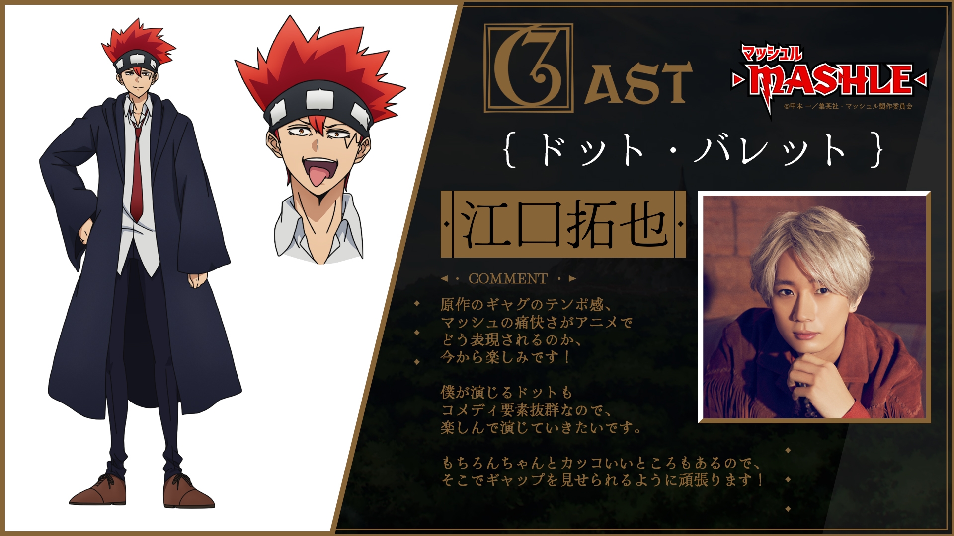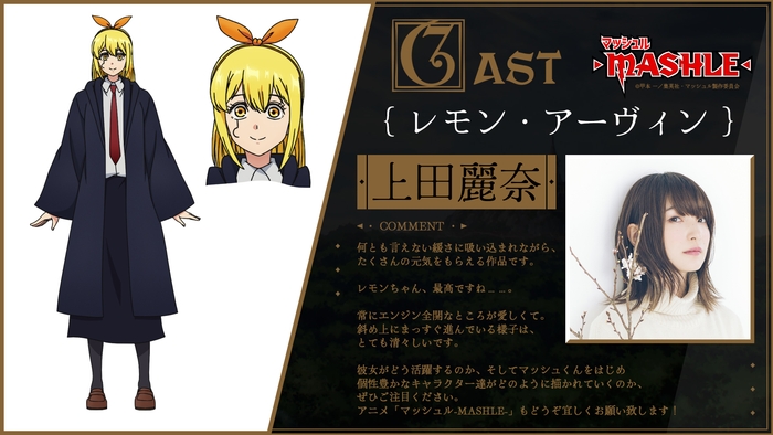 すでに解禁済みの主人公マッシュ・バーンデッド役小林千晃に加え、フィン・エイムズ役に川島零士、ランス・クラウン役に石川界人、ドット・バレット役に江口拓也、レモン・アーヴィン役に上田麗奈と、今勢いに乗っている豪華キャストが集結︕