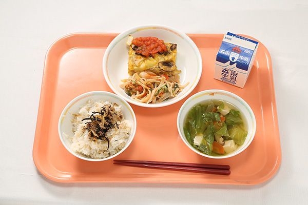 根菜ゴロゴロオムレツ+淡路のトマトソース、もち麦麺のイタリアンソース、レタスのスープ