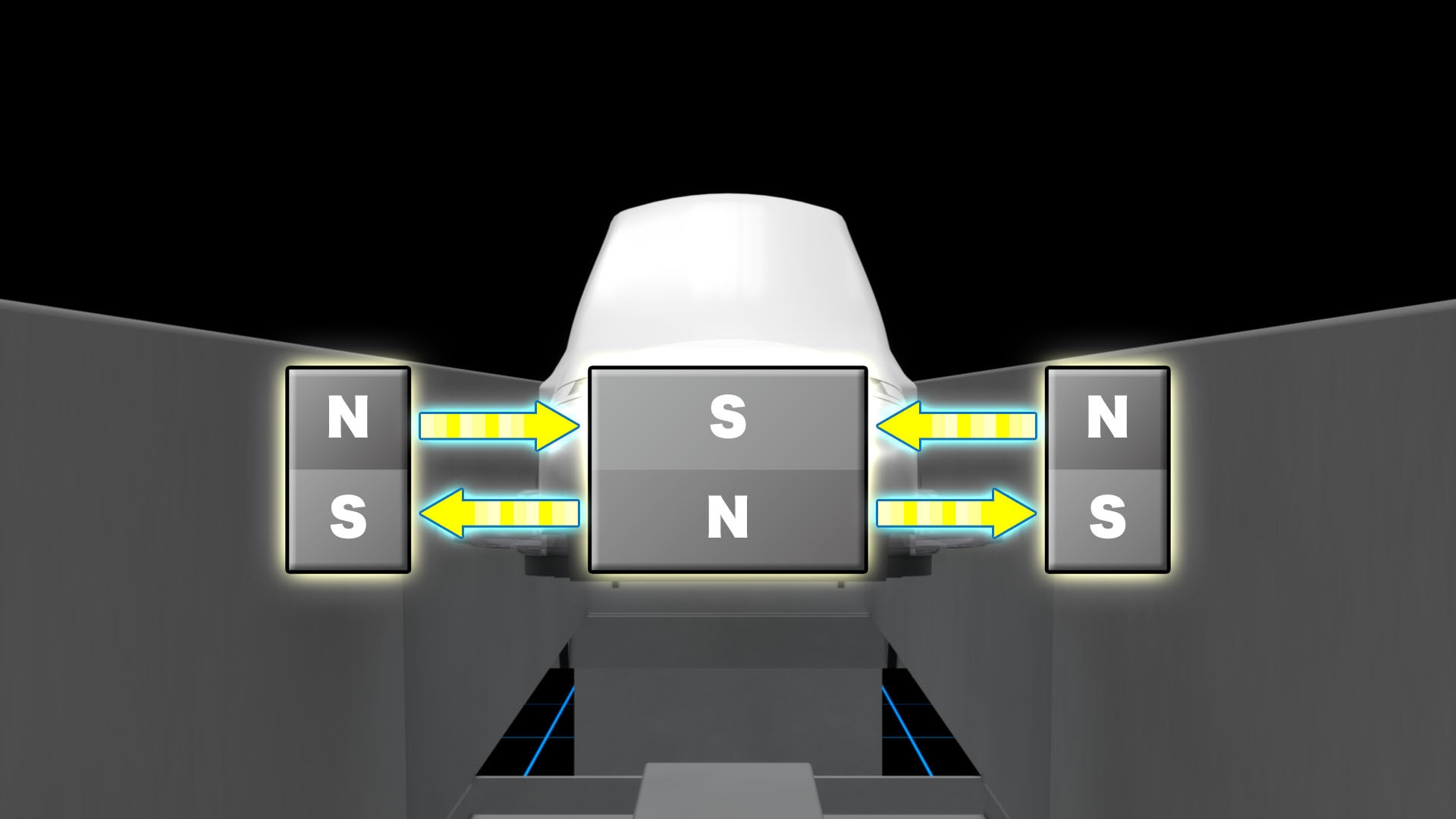 磁石の引力で浮上させ、大型コイルの反発力で推進させる高効率のシステムが、Nゲージリニアのために開発されました。また、浮上したまま走行するという構造上発生する振動を軽減すべく磁石の支持方法、車体の構造、1車両毎の重量バランスを組み合わせた振動抑制システムを開発しました。