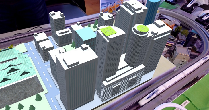 カメラ視点の動きに応じて仮想の都市ジオラマがあたかもそこに実在するかのように投影される!AR(拡張現実)技術を応用したARジオラマをリターンとしてご用意いたしました。