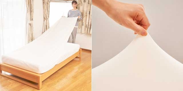 ポリウレタン配合で伸縮性抜群で、お餅のようにびよ~んと伸びます。シングルサイズからダブルサイズのお布団まですっぽり包みます。寝ている間もお肌にフィットするから、朝までずっととろける寝心地です。