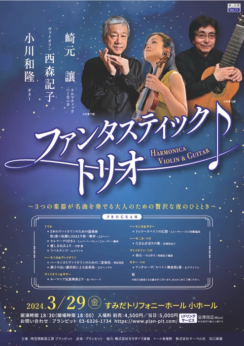 プランピットでは、「時ノ空間」というテーマで過去10回にわたり楽器のもつ素晴らしい響きをデュオ・トリオといった編成で企画してまいりました。今回は、「ハーモニカ」と「ヴァイオリン」そして「ギター」というトリオで演奏いたします。クラッシックをハーモニカで演奏?と思われている方に是非一度は、聴いていただきたいコンサートです。 ハーモニカを他の楽器と肩を並べることができる表現を持った演奏することを掲げられ音楽家生活55年以上活躍されている日本を代表するアーティスト崎元讓さんを中心に今回はハーモニカの他にヴァイオリンそしてギターを加えたトリオの演奏です。