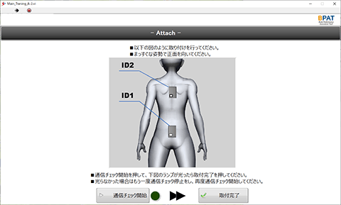 BPATではケーブル不要・簡単装着の小型センサーを数個取り付け、PCソフトで項目を選択、ボタンを押すだけ。