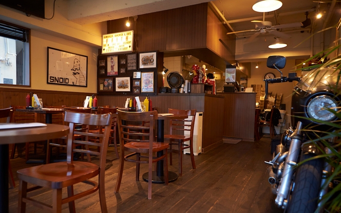 店内は明るいながらもカジュアルダイナーのような雰囲気で、レトロなバイクなどが飾られています。