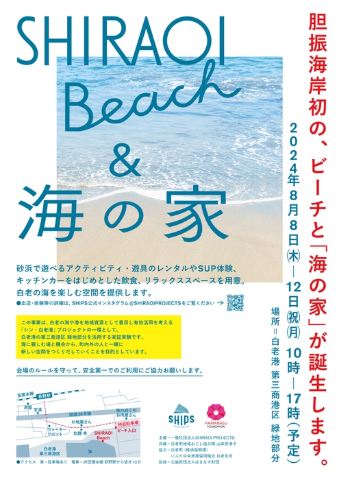 白老町の魅力の発見とコンテンツ創出・発信を行っている一般社団法人SHIRAOI PROJECTS(シラオイプロジェクツ/通称 SHIPS シップス 代表:山岸 奈津子/白老町地域おこし協力隊)は、2024年8月8日(木)〜12日(月・祝)までの5日間、胆振海岸で初となる「SHIRAO BEACH&海の家」をオープンします。
