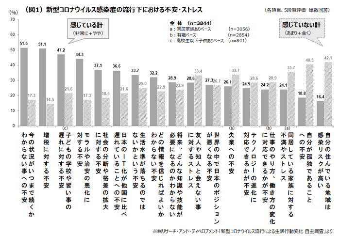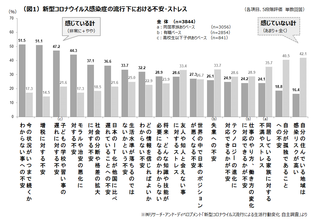 新型コロナウイルス感染症流行下における不安やストレスについて尋ねたところ、「今の状況がいつまで続くのかわからない」「増税に対する不安」を“感じている”とした人は全体の約5割であった。「モラルや治安の悪化」「社会の分断や格差の拡大」を感じているとした人も約4割にのぼる。一方、「自分の住んでいる地域は感染リスクが高い」とは“感じていない”と回答した人は4割であった。