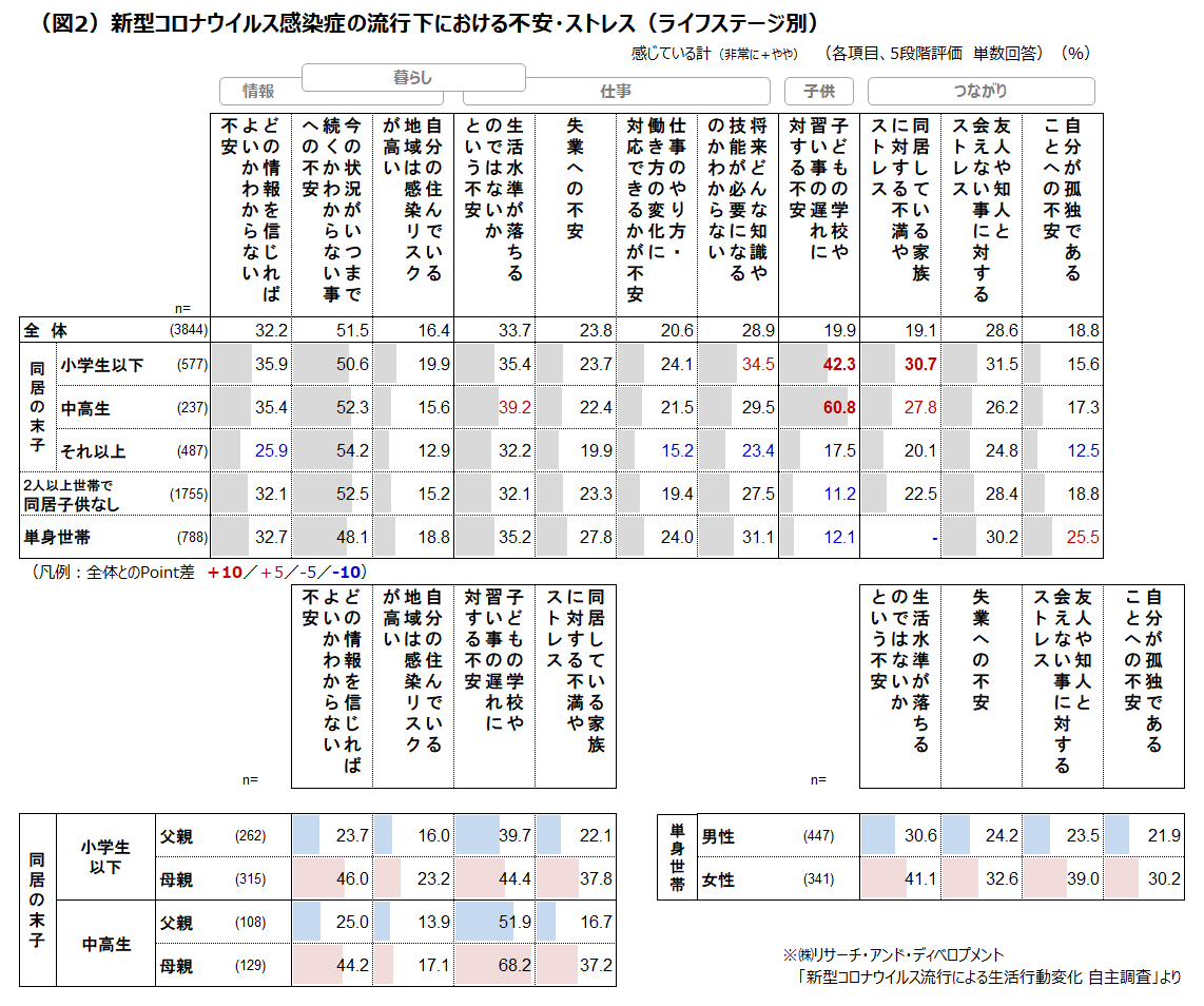 末子中高生/小学生以下の世帯の不安やストレスについては「同居家族に対する不満やストレス」を感じる人が3割と多め。父親より母親の方が不満・ストレスを感じる人が多く4割にのぼる。また、「子供の学校や習い事の遅れに対する不安」を感じる割合も高く、末子中高生の世帯では6割と半数を超える。特に母親では7割近くが不安に感じている。