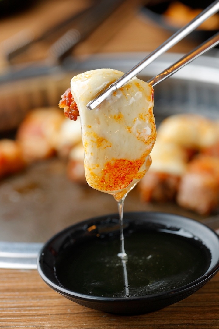 軽く焦げ目がつく程度に焼いて食べると、外はカリッと香ばしく、中はトロ~リとろけたチーズに。このように焼くことによって、チーズの風味が増すばかりでなくチーズそのものの美味しさをまるごと味わっていただけます。熟成肉専門店ヨプの王豚塩焼の看板メニュー、熟成サムギョプサルとの相性も抜群!