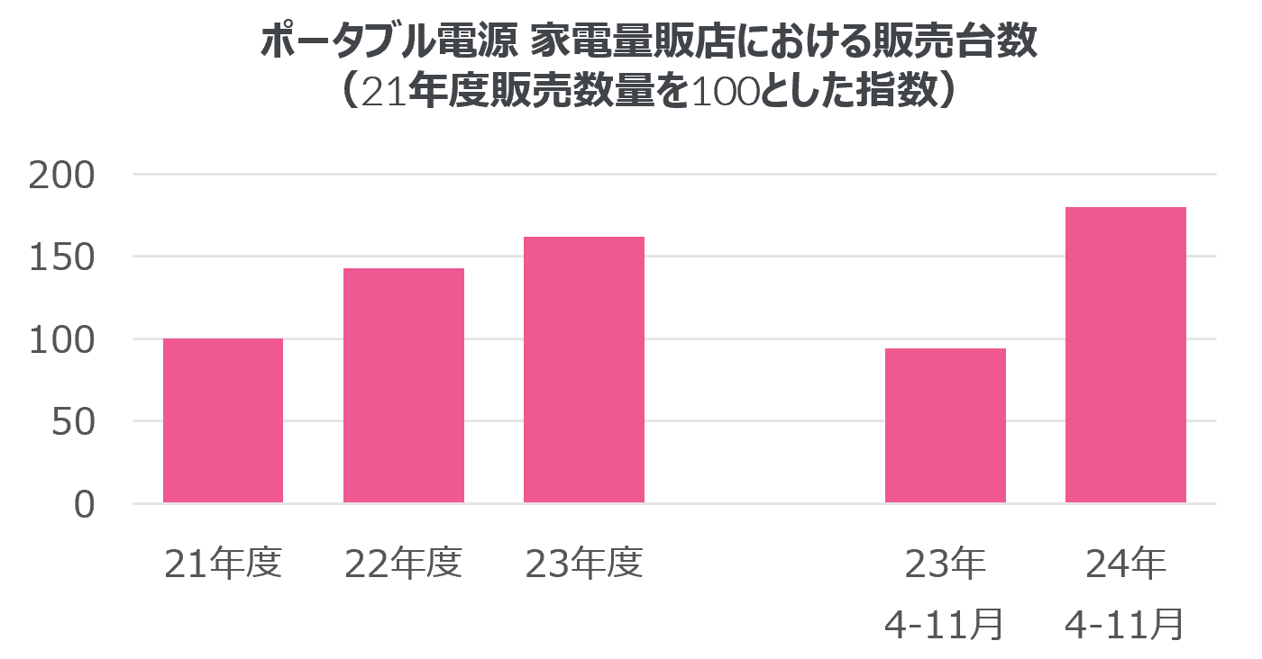 日本は地震や台風などの自然災害が多く、その影響で停電が発生するケースも多い。このような非常時にスマートフォンや家電製品に給電できるポータブル電源の需要が高まっている。家電量販店における2024年4~11月の販売数量は前年同期比90%増と、約2倍に成長した。