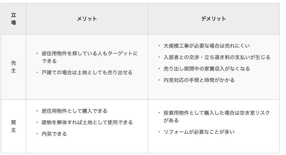 売主にとっては、売却活動期間中も家賃収入を得られるのがメリットです。投資用物件を探している買主にとっては、購入時点での空き室リスクがないことがメリットといえます。