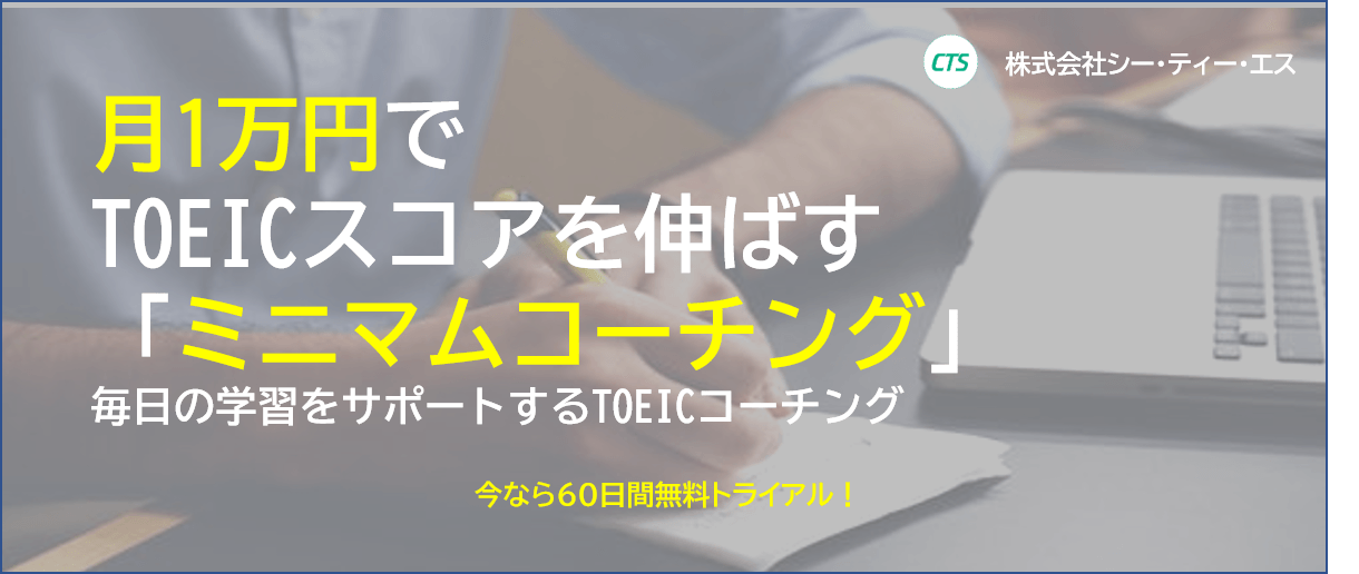 企業向け英語研修の株式会社シー・ティー・エス(本社:大阪府大阪市北区、代表取締役:岩名 葵、以下、CTS)は、TOEIC®を昇格要件としている企業のビジネスパーソン向けに、1か月1万円でパーソナルコーチングを受けることができる「ミニマムコーチング」の提供を開始致しました。「ミニマムコーチング」とは、専属コーチが受講生の目標に合わせて、面談とチャットで日々の学習サポートを行うサービスです。