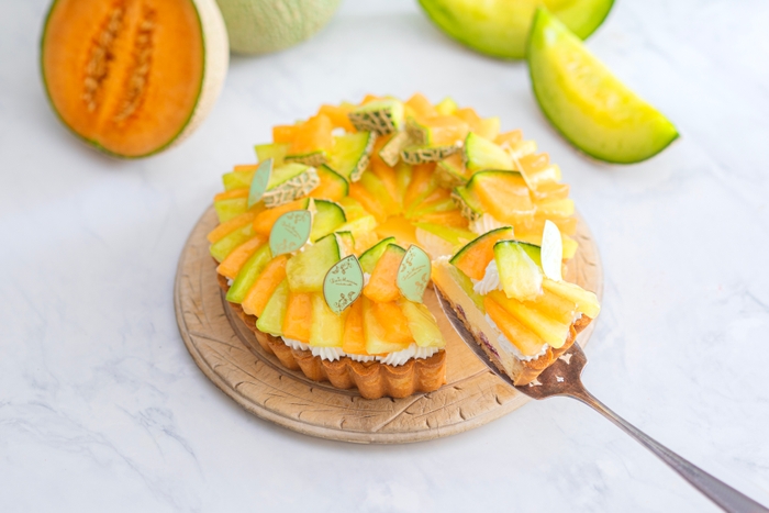旬の果汁をたっぷりと含んだ高糖度の「肥後グリーン」甘みが強くジューシーな「クインシーメロン」の2種のメロンを楽しめる季節のタルト。