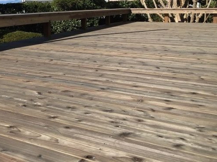 屋久島由来の植林杉を使用した、サウナ後の「ととのい」にぴったりのウッドデッキを露天風呂に造作します。