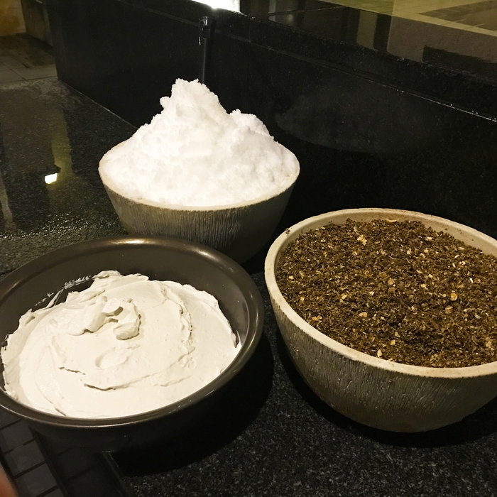 蒸気の増した蒸し蒸しの室内で、よもぎスチーム×泥パック×塩の三重奏をお楽しみいただけます。