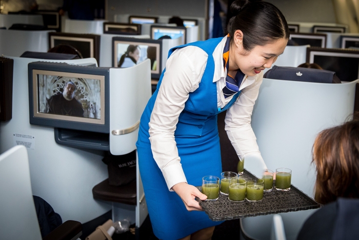●長時間のフライトの疲れを癒してくれる、爽やかなカラーのグッドバイドリンクを到着直前にお持ちします。現在提供しているグッドバイドリンクは爽やかなグリーンで、キウイや野菜などを組み合わせたヘルシーでジューシーな味わいです。