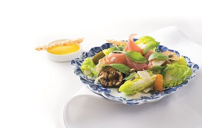 燻製トリ胸肉の薄切り、レタス、ミニトマト、パルメザンチーズ、クルトン、シーザードレッシング、フルーツサラダとおかき
