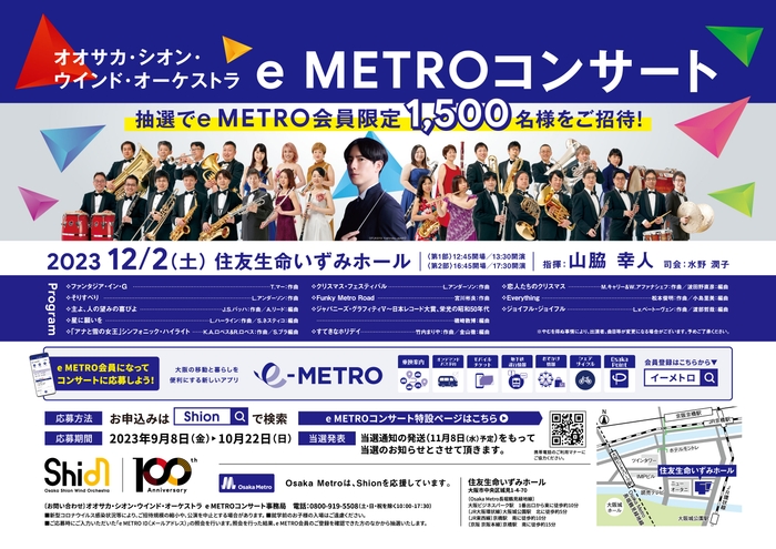 大阪市高速電気軌道株式会社(Osaka Metro)と公益社団法人大阪市音楽団(Shion)は、2023年12月2日(土)に住友生命いずみホールで開催するオオサカ・シオン・ウインド・オーケストラによる e METRO会員様限定コンサート「e METROコンサート」に、抽選で1,500名様を無料でご招待します。