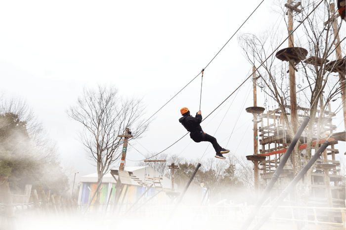 アスレチック「アッパレ!戦国大冒険」のもののけコースのミニジップライン足元に雲海のように広がるスモークを噴出。足元が見えないスリル満点の雲海アスレチックをお楽しみ頂けます。同時に、アスレチック各コースを楽しめる単品チケットも販売いたします。