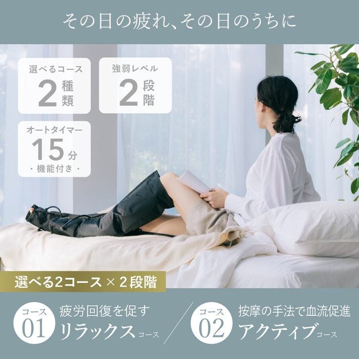 自動圧力センサーが足の太さを感知して圧力を調整するので、誰でも快適にマッサージを受けられます。あん摩とマッサージ、2つのコースで筋肉のコリをほぐし、血行を促進します。