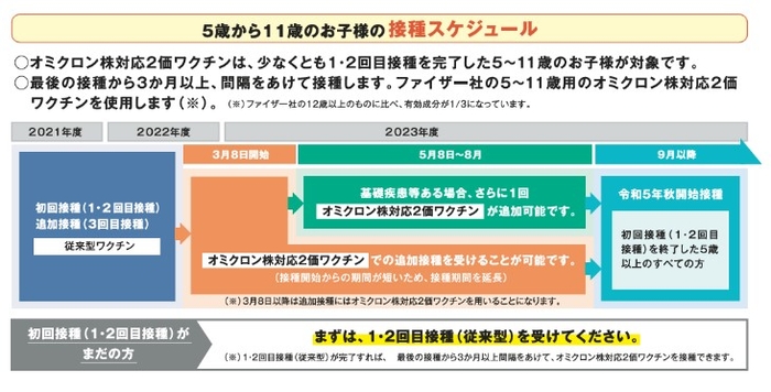 5歳から11歳のお子さんで初回接種(1.2回接種)が済んでいない方は、まずは従来型ワクチンの初回接種が必要です。こちらは2024年3月31日までが接種期間となります。