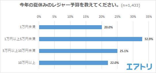 最も多かった金額は「1 万円以上5 万円未満」が32.9%、2 番目は「5 万円以上10 万円未満」(25.1%)、3 番目は「1 万円未満」(20.0%)でした。「5 万円未満」と回答した人を合わせると52.9%となった一方で「10 万円以上」と回答した人は22.0%となり、30.9 ポイント差となりコロナ禍の夏休みいうこともあってか、予算を控えめにしたい人が多いことが見受けられました。