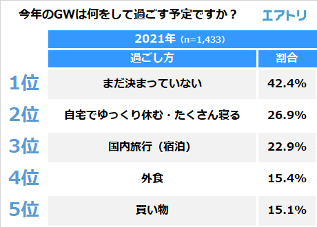 1 位は「全く決まっていない」(42.4%)、2 位は「自宅でゆっくり休む・たくさん寝る」(26.9%)、3 位は「国内旅行(宿泊)」(22.9%)でした。