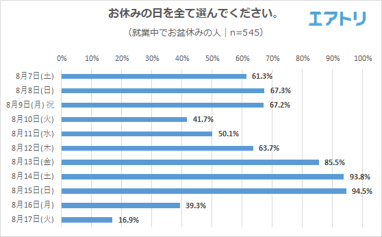 最も多かったのは「8 月15 日(日)」(94.5%)で、「8 月14 日(土)」(93.8%)、「8 月13 日(金)」(85.5%)と続きました。