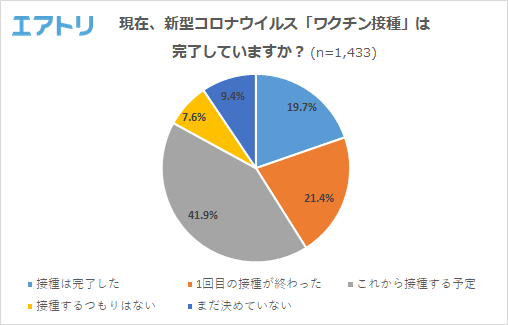 新型コロナウイルス「ワクチン接種」の進捗状況を聞いてみたところ、「これから接種する予定」(41.9%)が最も多く、「1 回目の接種が終わった」(21.4%)、「接種は完了した」(19.7%)と続きました。
