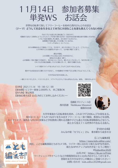 トークライブや海外からのライブ授業などで多くのこども達に伝えてきた西川さんならではの"こどもに届く言葉"でお話していただきます。