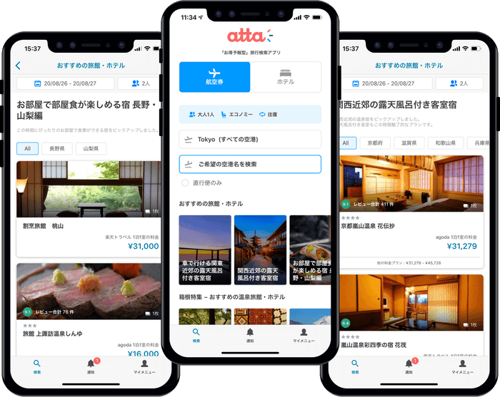 2019年7月から展開をしている「お得予報型」旅行サービスattaは旅行者にお得に航空券や宿泊施設をご予約できるタイミングをお知らせしています。