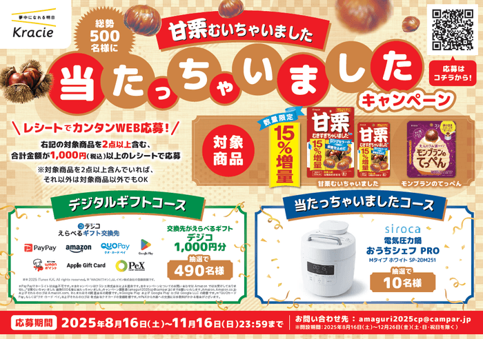 対象商品(「甘栗むいちゃいました35g(15%増量パッケージ)」「甘栗むいちゃいました70g(15%増量パッケージ)」「モンブランのてっぺん」)の中から、2点以上を含む合計金額が1,000円(税込)以上のレシートで応募すると、抽選で素敵なプレゼントが当たるキャンペーンも実施いたします。