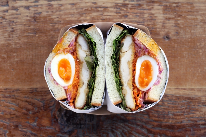 ボリュームのあるターキーカツ、半熟のボイルドエッグ、レッドキャベツのコールスロー、レタス、キャロットをホワイトブレッドで豪快にはさみました。いろどりの良いサンドウィッチをバビーズ特製ソースでどうぞ。