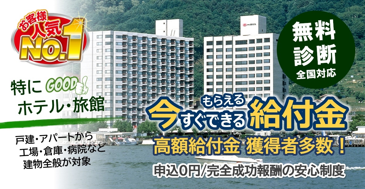 戸建、アパート、工場などを対象に「どれくらいの給付金が得られるか」を無料診断!着手金0円/無料調査で安心してお申込いただけます。