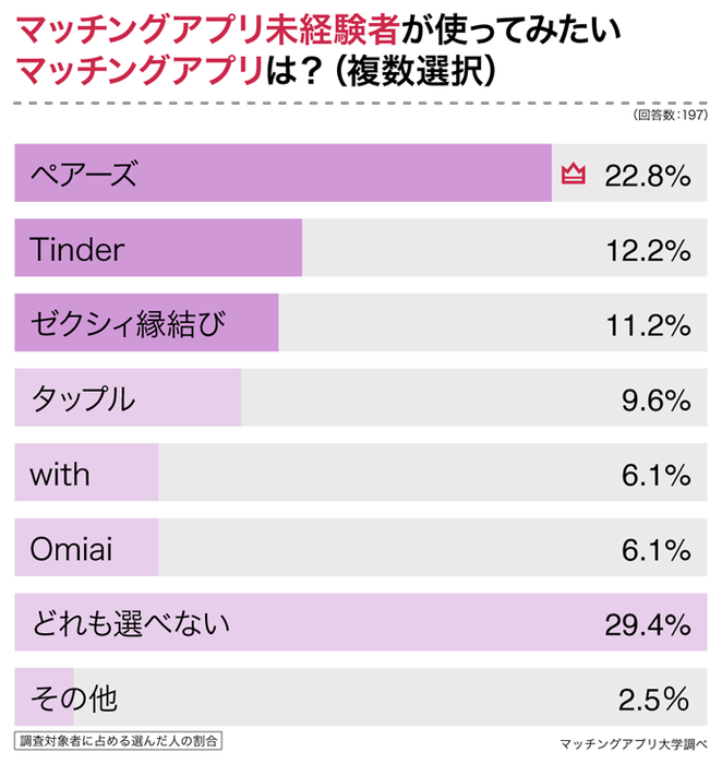 「今後使うなら、どのマッチングアプリを使ってみたいか」という質問では、ペアーズが22.8%、Tinderが12.2%、ゼクシィ縁結びが11.2%という結果でした。
