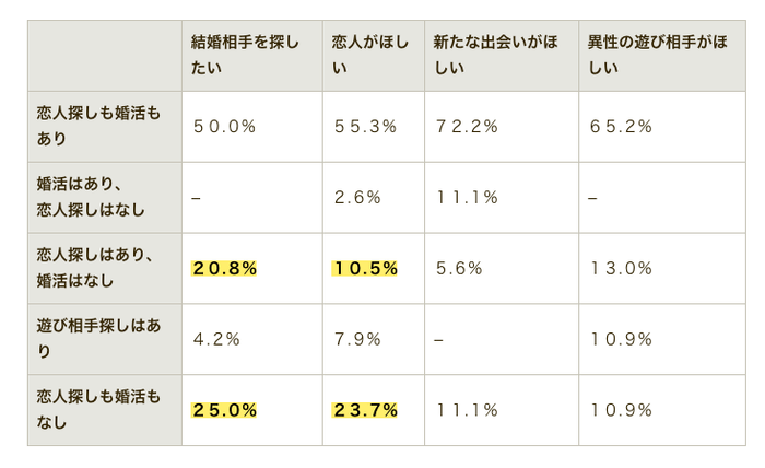 また、回答者の恋愛・結婚願望の度合い別にマッチングアプリに対するイメージを整理すると、「マッチングアプリでの婚活はなし(考えられない)」と回答した割合が最も高かったのは「結婚相手を探したい」という男女で、その次に高かったのは「恋人がほしい」と願う男女だということがわかりました。