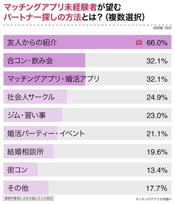 しかし、そのような“自然な出会い”は意外とハードルが高く、友達が多い人や、職場に異性が多い人でなければ難しいのが現実ではないでしょうか。“自然な出会い”が支持される一方で、32.1%のマッチングアプリ未経験者はパートナー探しの選択肢にマッチングアプリを選んでいます。