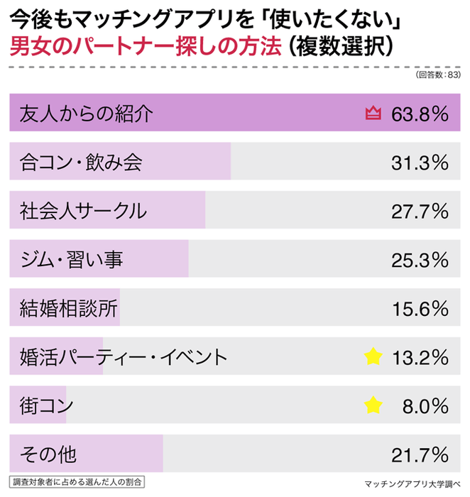 「今後マッチングアプリを使ってみたいか」という問いに対し、「使いたくない」と回答した男女が望むパートナー探しの方法は、こちらも1位は63.8%で「友人の紹介」でした。