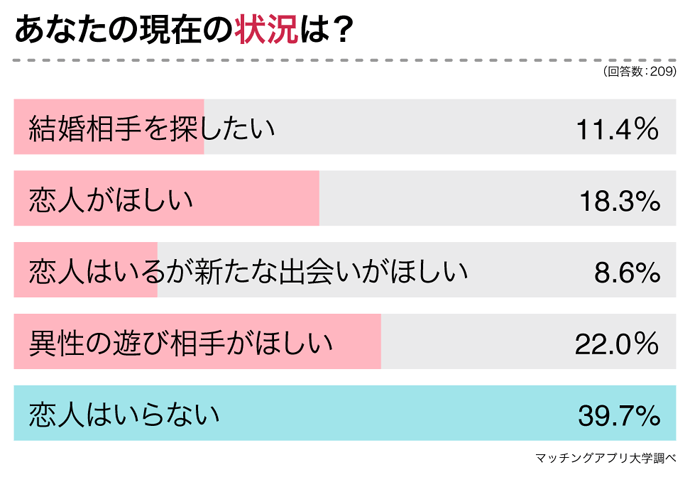 マッチングアプリの未経験者に恋愛に関する状況を質問したところ、60.3%の男女が新しい出会いを求めているという結果になりました。結婚相手、恋人、遊び相手など目的はさまざまですが、半数以上が異性との出会いを求めている状況です。