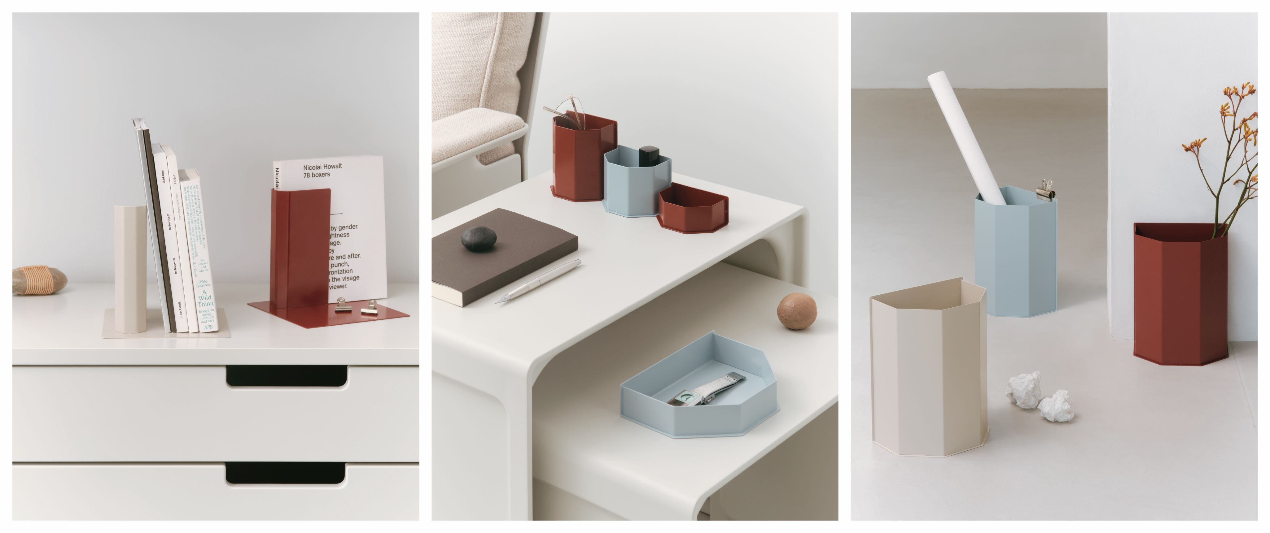 高さの異なる3サイズからなるコンテナシリーズ。雑然としがちなデスク周りを直感的に心地よく整え、快適なステーショナリースペースを誘発します。