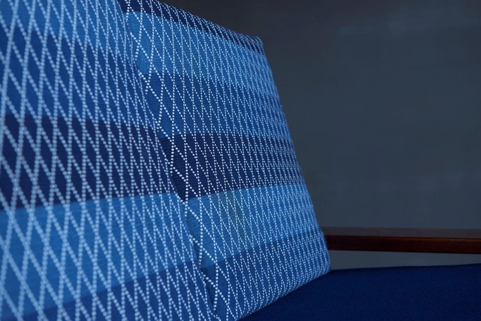 今回、藍染めのクッションカバーを群言堂、木部をオークヴィレッジが制作いたしました。藍染めのカバーは背面と座面で異なる染めや織りを施し、楢(ナラ)を用いた漆塗の木部は、金具を使わず全て木組みを用いるなど、随所に職人の技術が込められています。
