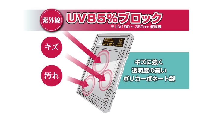 フルプロテクトパックケースはUV190nm~370nmすべての波長帯を99%カット、UV370nm~380nmの波長帯を85%カットします。