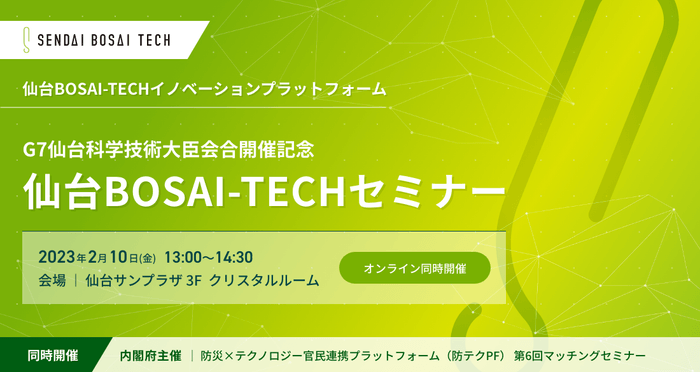 この事業の一環として、G7仙台科学技術大臣会合開催記念「仙台BOSAI-TECHセミナー~先端テクノロジーを防災へ~」を開催する。仙台市沿岸部で導入された自律型津波避難広報ドローンの実装事例の紹介や、先端テクノロジーの防災への活用を図る仙台BOSAI-TECH会員企業・団体による講演を行い、先端技術の発信や防災事業に取り組む企業間の連携を促進する。