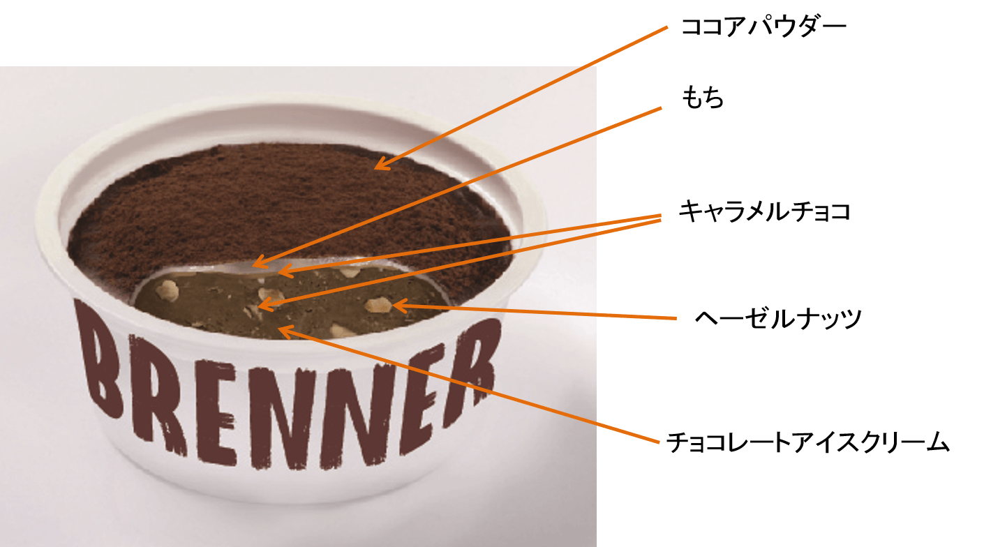 今回発売する『マックス ブレナー チョコレートキャラメルMOCHIアイスクリーム』(以下:本商品)はこれまでのシリーズ同様、「食感」の豊かさにこだわりました。一層目のチョコレートアイスクリームの中にはローストしたヘーゼルナッツとキャラメルチョコを混ぜ込み、さらに二層目にもキャラメルチョコを敷いて「カリッ」「パリッ」とした食感を演出。その上には「マックス ブレナー」との共同開発商品では初めて和の食材・もちをのせ、下の層とは異なる「モチッ」とした食感を加えました。そして天面にはココアパウダーをまぶし上品に仕上げています。