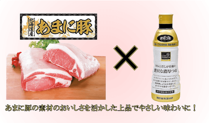 ①“北海道産あまに豚”と“ライフプレミアム濃厚つゆ”を使用